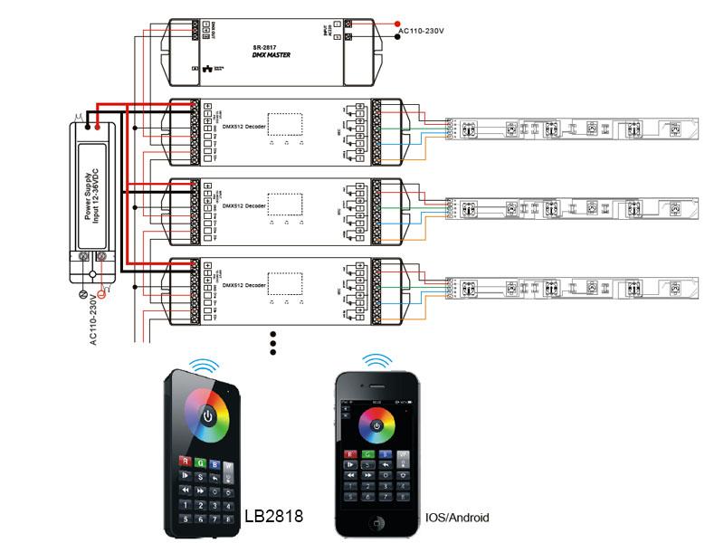 Recoje la señal de un mando a distancia compatible RF  LB2819 (no incluido) y la convierte en señal  DMX512 estándar que envía a otros decoder DMX para tener un control total sobre las tiras led o proyectores conectados.