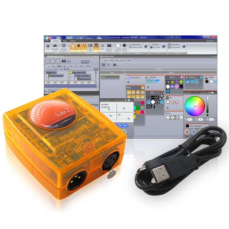 El Suite2-BC incluye el software Sunlite Suite2 y ofrece 512 canales de salida DMX y 512 canales de entrada DMX.