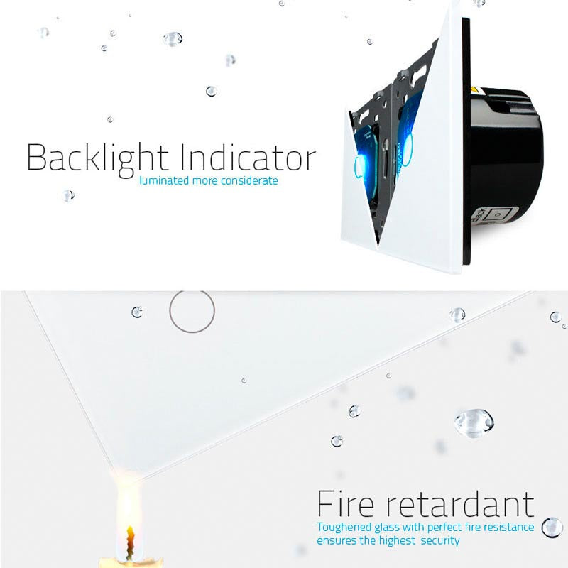 Todos los mecanismos eléctricos disponen de alta resistencia al fuego gracias a su panel frontal hecho de vidrio templado que aporta gran seguridad y al a vez están protegidos contra la humedad gracias al panel frontal de vidrio totalmente impermeable.