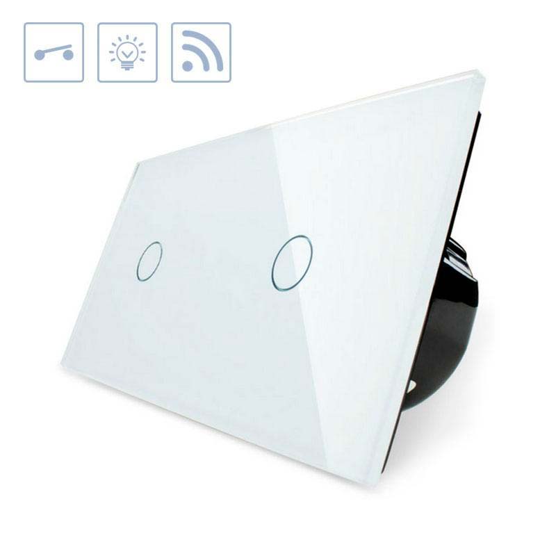 Interruptor doble de 2 cuerpos con 2 encendidos en color blanco con función de control remoto (vía RF). Interruptor eléctrico de empotrar con cuerpo de aluminio y panel frontal táctil iluminado de cristal templado con acabado de alta calidad y diseño minimalista.