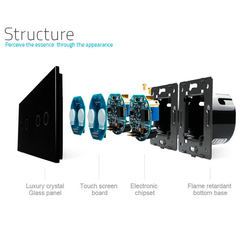 Interruptor doble de 2 cuerpos con 4 encendidos en color negro con función de control remoto (vía RF). Interruptor eléctrico de empotrar con cuerpo de aluminio y panel frontal táctil iluminado de cristal templado con acabado de alta calidad y diseño minimalista.