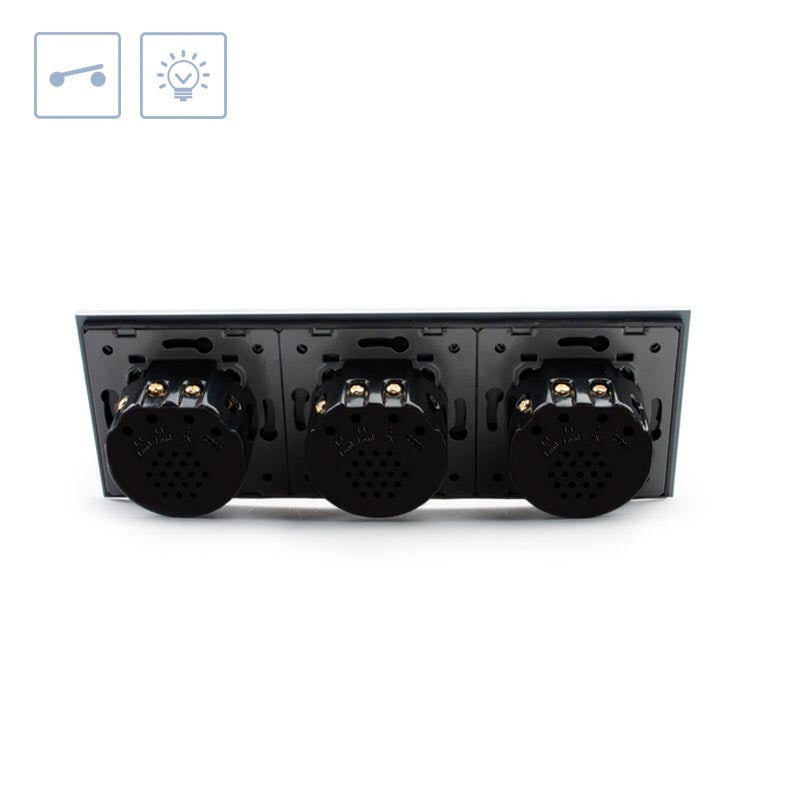 Interruptor de 3 módulos con 6 encendidos en color negro. Interruptor eléctrico de empotrar con cuerpo de aluminio y panel frontal táctil iluminado de cristal templado con acabado de alta calidad y diseño minimalista.