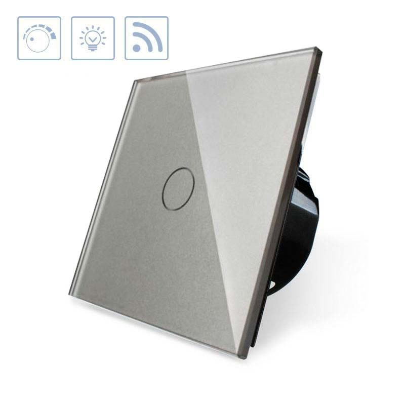 Interruptor sencillo de 1 cuerpo con 1 encendido en color gris con función de control remoto (vía RF) y función de regulación, que permite variar la intensidad de las luminarias (siempre y cuando las luminarias conectadas tengan función de regulación). Interruptor eléctrico de empotrar con cuerpo de aluminio y panel frontal táctil iluminado de cristal templado con acabado de alta calidad y diseño minimalista.