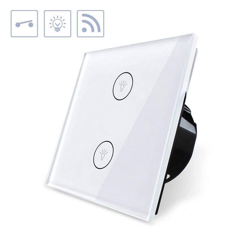 Interruptor táctil sencillo de 1 módulo con 2 encendidos en color blanco. Interruptor eléctrico de empotrar con cuerpo de aluminio y panel frontal táctil iluminado de cristal templado con acabado de alta calidad y diseño minimalista. Control por WiFi, App Ios, Android, por voz, Alexa, Google Home.