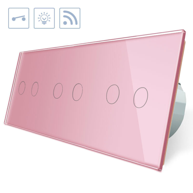 Interruptor de 3 cuerpos con 6 encendidos en color rosa con función de control remoto (vía RF). Interruptor eléctrico de empotrar con cuerpo de aluminio y panel frontal táctil iluminado de cristal templado con acabado de alta calidad y diseño minimalista.