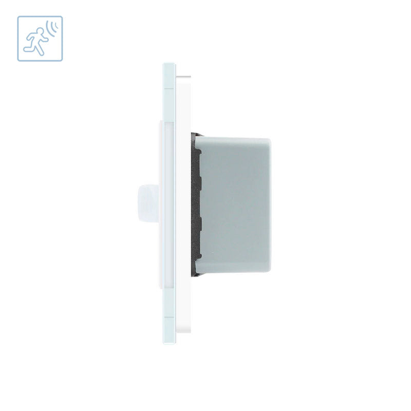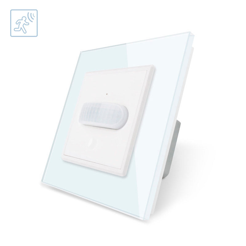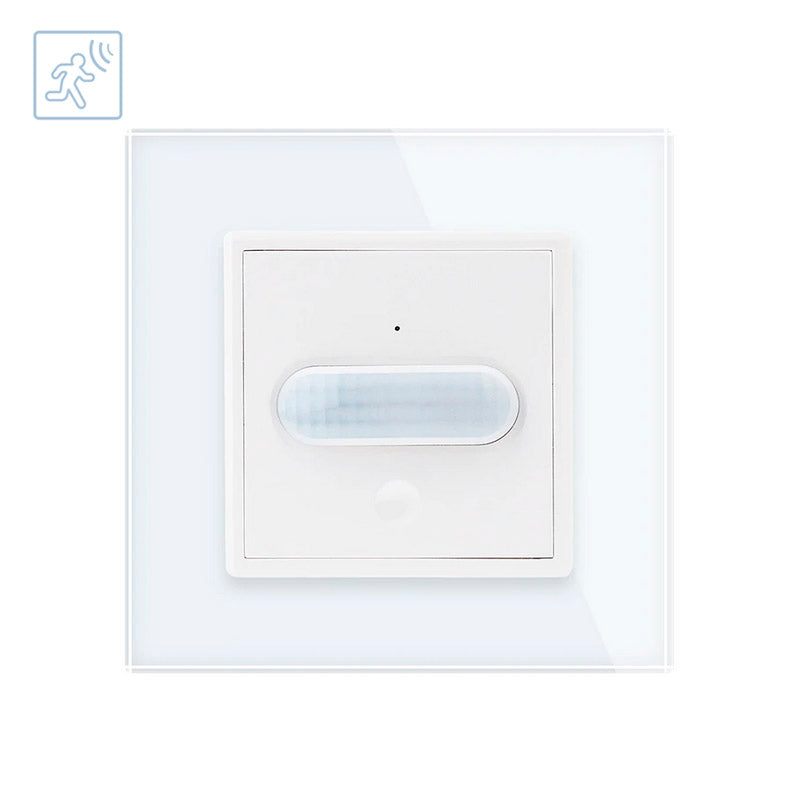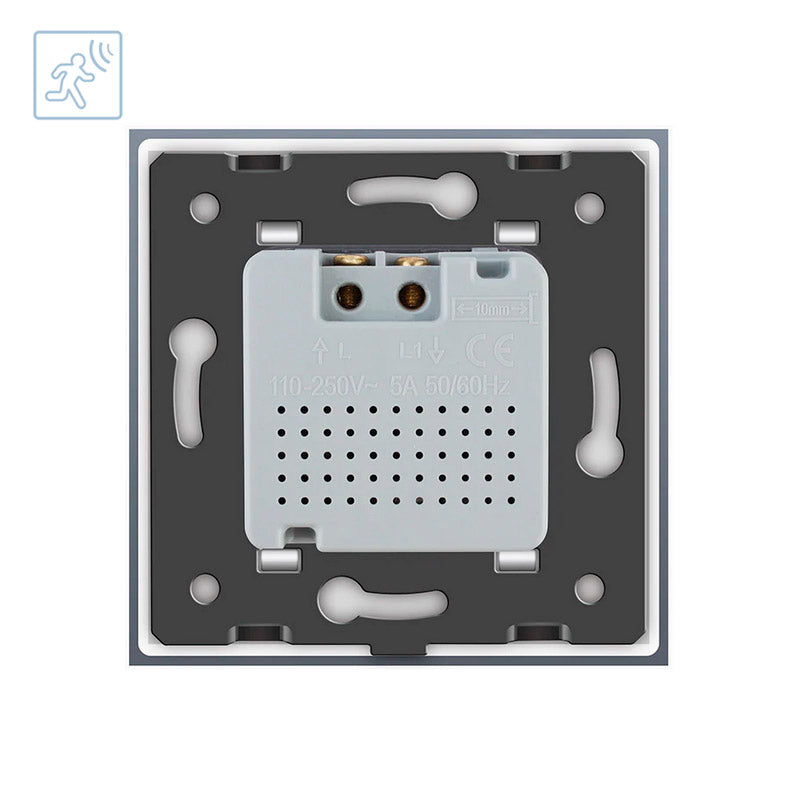 Sensor de movimiento y luminosidad de máxima calidad que permite el encendido de las luces cuando detecta movimiento en su radio de detección y la luminosidad ambiente es menor a los lux configurados.  Con panel frontal de cristal templado con acabado de alta calidad y diseño minimalista.