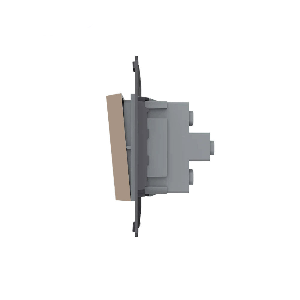 Mecanismo de empotrar EU, interruptor de cruzamiento. Con 1 tecla media de color dorado. NO INCLUYE marco metálico ni panel frontal de cristal. (el marco frontal de cristal incluye el marco metálico) Sirve para encender y apagar la luz desde tres lugares diferentes. Por ejemplo, un pasillo, donde tienes un mecanismo en la entrada, otro en la parte media del pasillo y otro al final. Se combina con dos interruptores-conmutadores.