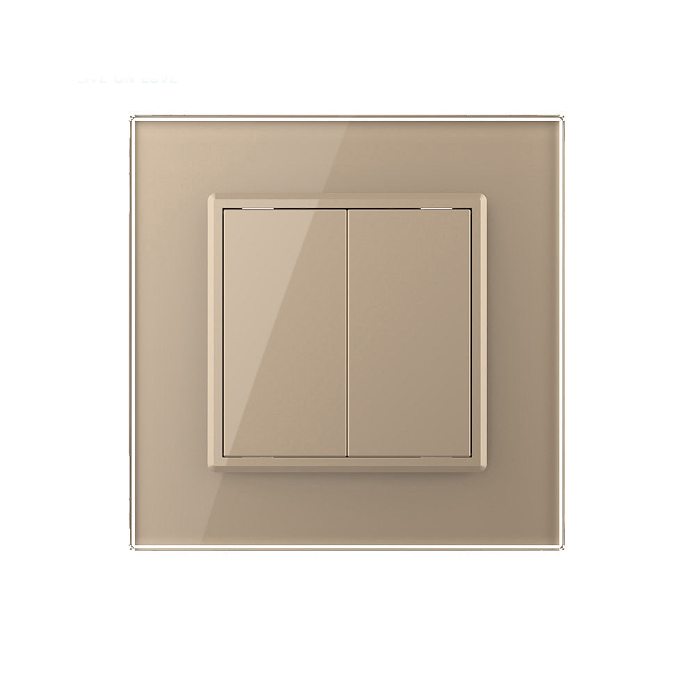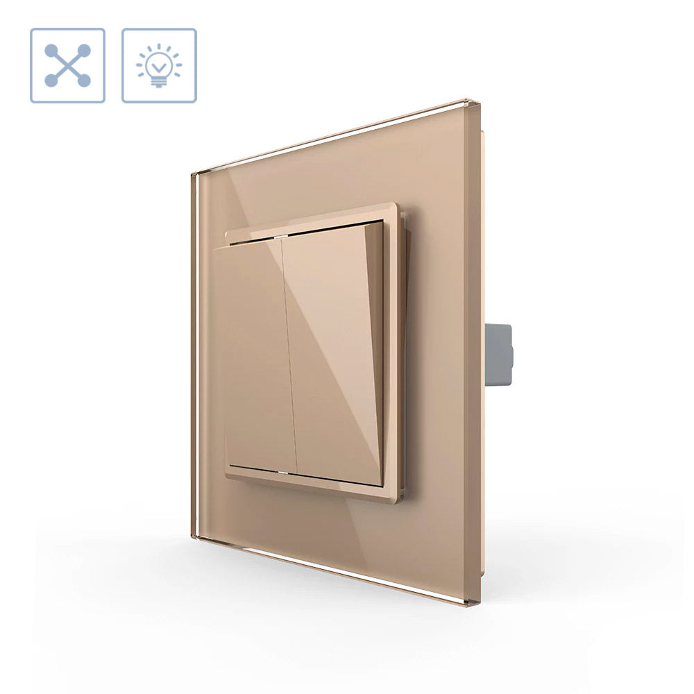Mecanismo de empotrar EU, interruptor conmutador. Con 2 media teclas y marco de cristal de color golden. Incluye marco metálico y panel frontal de cristal. Sirve para encender y apagar la luz desde tres lugares diferentes. Por ejemplo, un pasillo, donde tienes un mecanismo en la entrada, otro en la parte media del pasillo y otro al final. Se combina con dos interruptores-conmutadores.