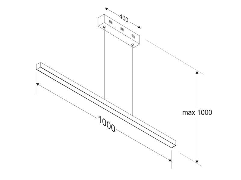 Incluye cables de suspensión que se pueden ajustar a la medida deseada fácilmente hasta 1 metro de longitud. El driver led se oculta en el florón del techo. El cable de alimentación simula un cable de acero, por lo que visualmente solo se ven dos cables verticales  similares que descuelgan del techo, dando a la luminaria una estética limpia y minimalista. Es posible hacer hasta dos metros de longitud bajo pedido.