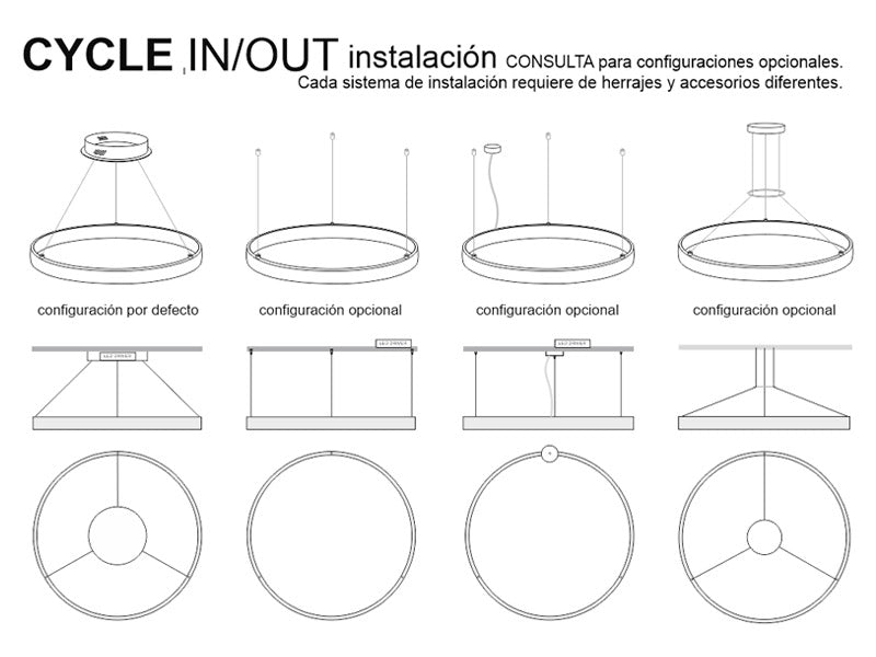 Incluye: Luminaria circular con cables de suspensión y caja de conexiones en superficie.