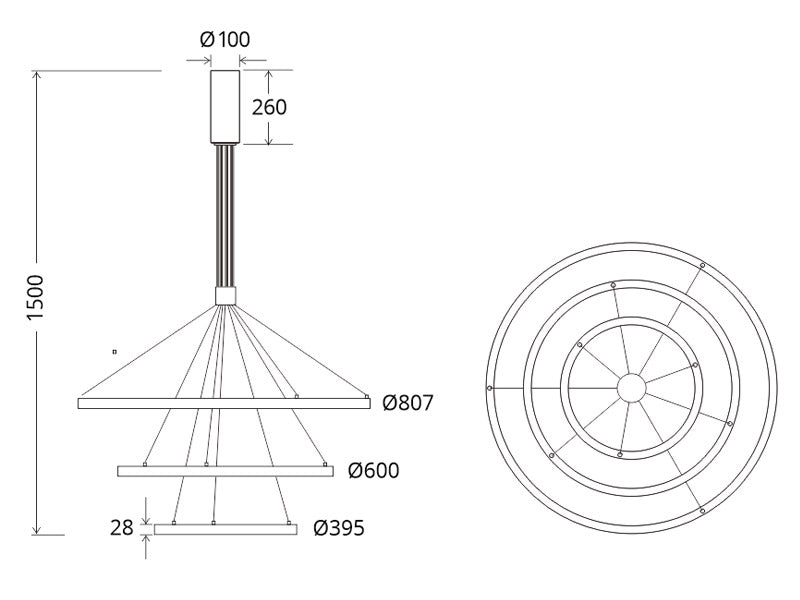 Incluye: Luminaria circular con tres aros con cables de suspensión y caja de conexiones en superficie.