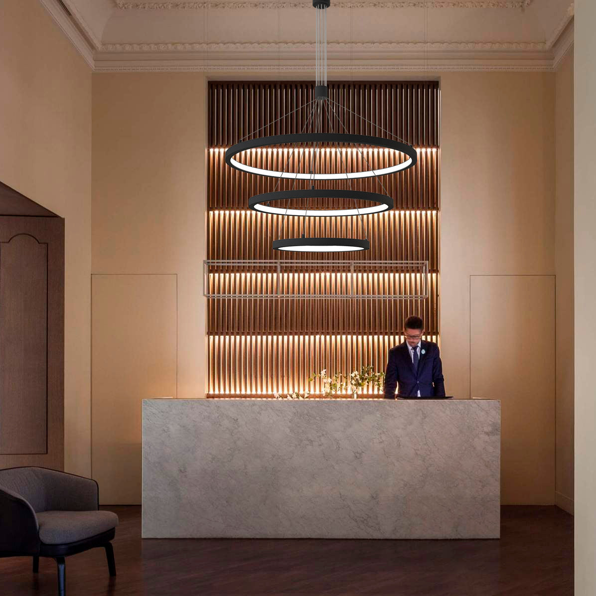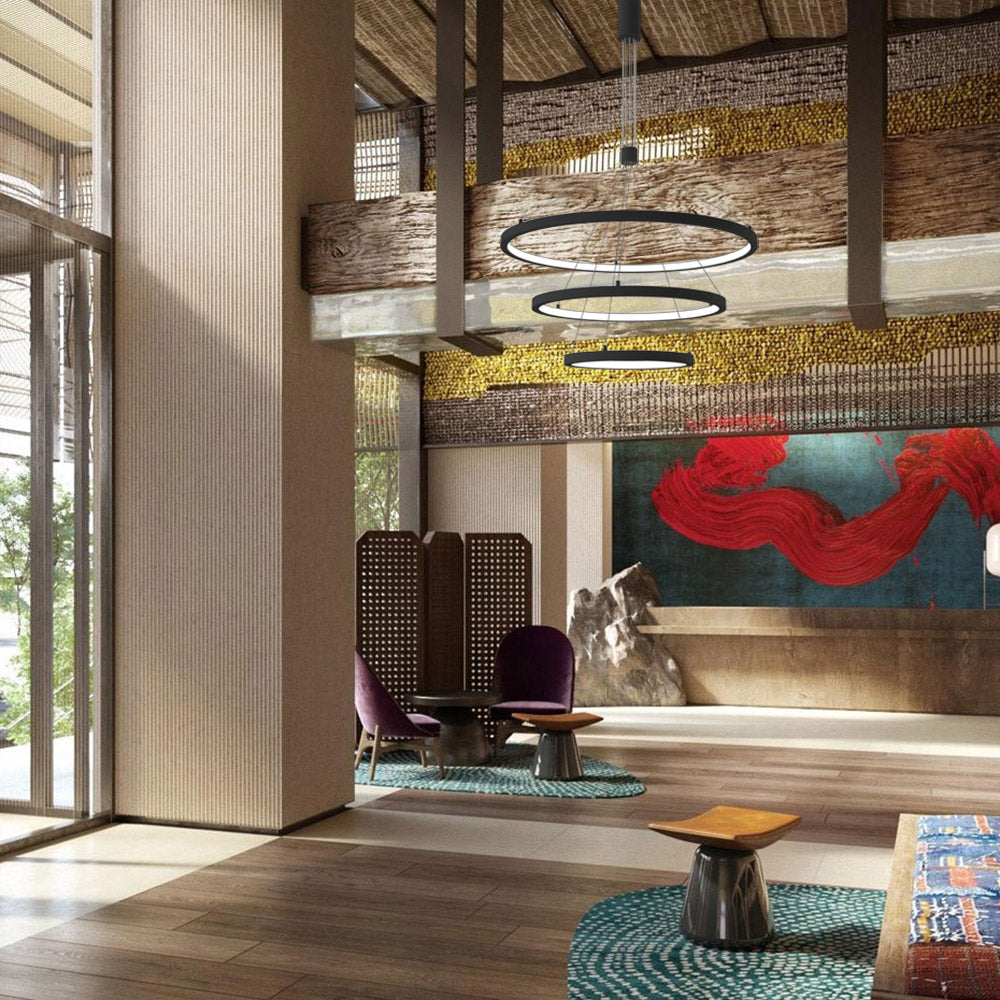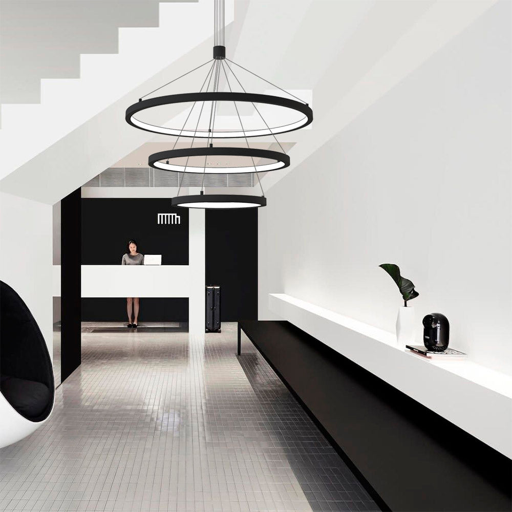 Luminaria de suspensión que combina tres aros de distintos diámetros que forma una composición perfecta para iluminar amplios espacios a la vez que aporta con su diseño un foco de atención en cualquier estancia. Incorpora driver led TRIAC regulable y todos los accesorios para su instalación.