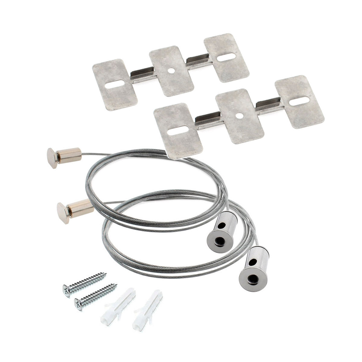 Incluye cables de suspensión que se pueden ajustar a la medida deseada fácilmente hasta 1 metro de longitud. Y clips de fijación en superfice.