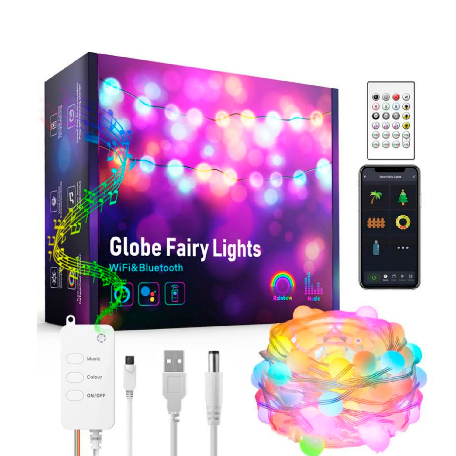Incluye: 10m de guirnalda led con 66 globos led, controlador Wifi, mando a distancia IR y cable USB de carga, puedes (necesita un adaptador de corriente USB 5V)