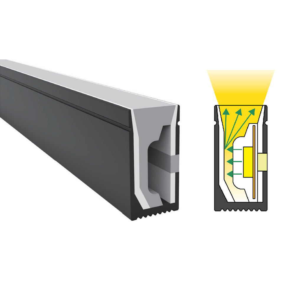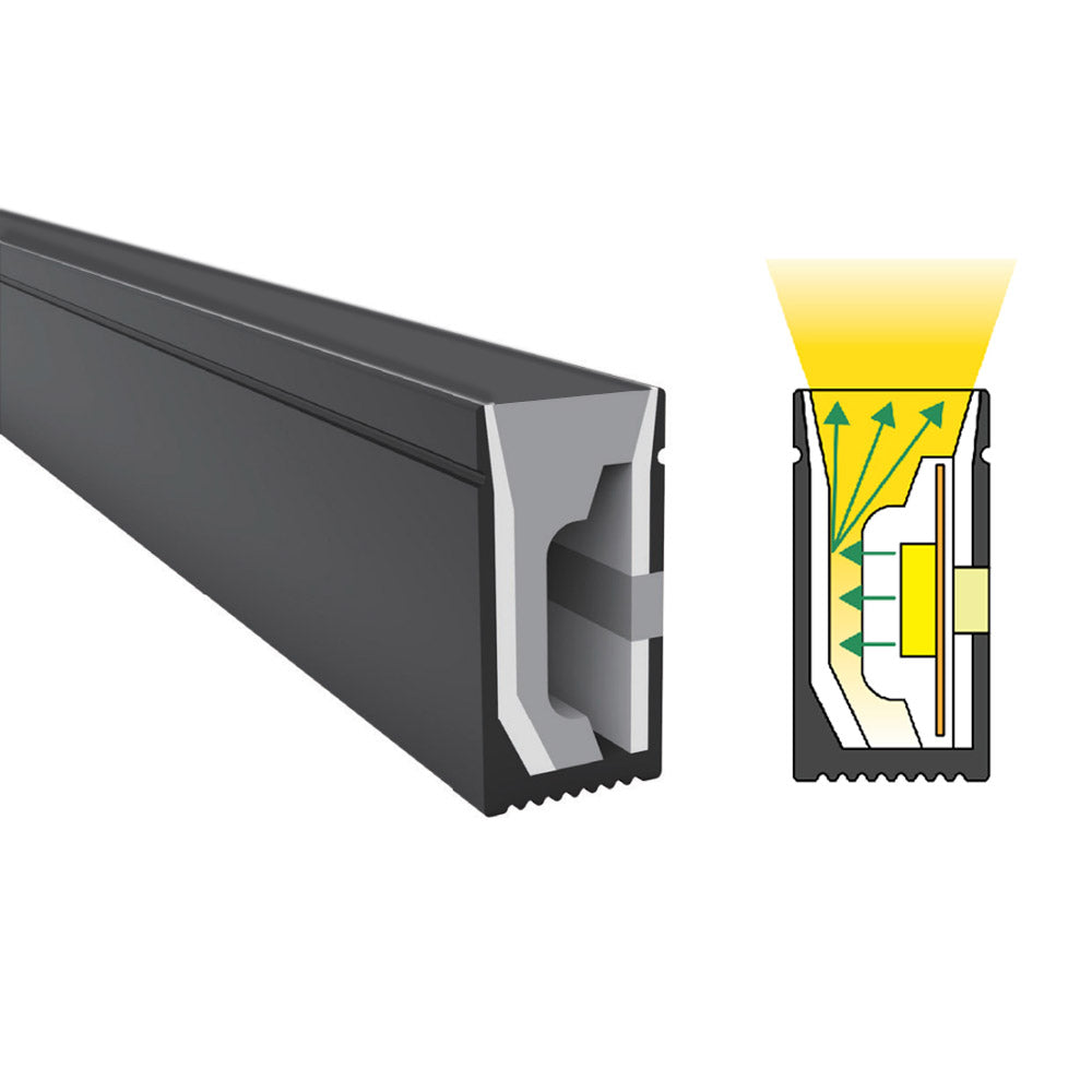 - Está compuesto por 360 chip led SMD5050, en tubo NEON de silicona. 360 microprocesadores integrados, gracias a los cuales se pueden conseguir infinidad de efectos diferentes, las tiras normales de RGB pueden tener como máximo 15 efectos. negra flexible (3 lados negros y frontal blanco opal).