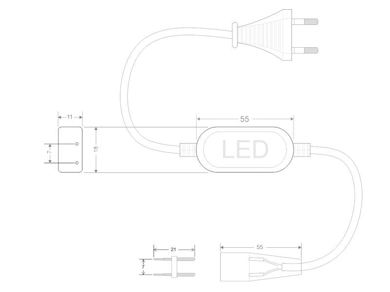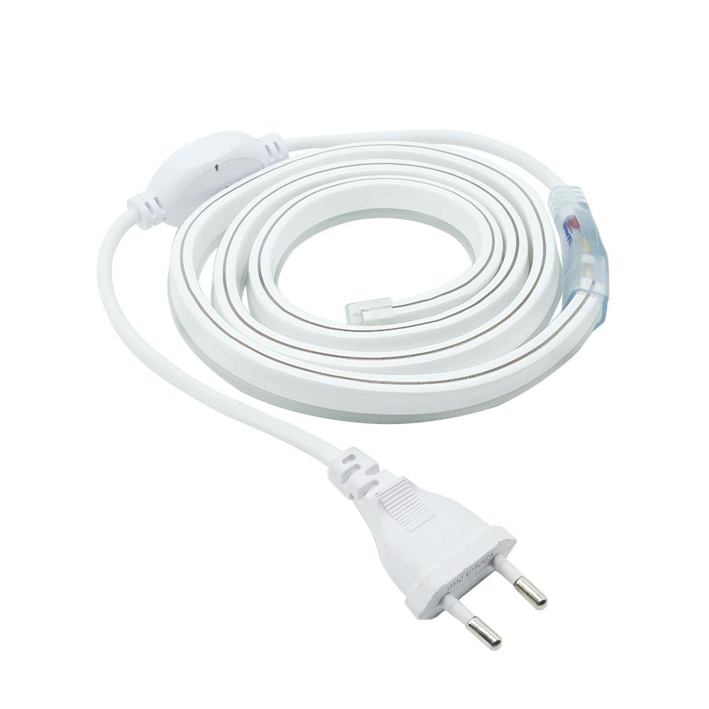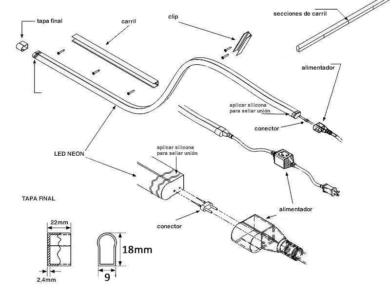 Permite conectar de manera directa la el LED NEON MINI de alta tensión a la red eléctrica de 220V directamente, sin necesidad de transformadores ni ningún otro dispositivo adicional. Cada alimentador soporta un máximo de 80 metros de LED NEON MINI a 220V