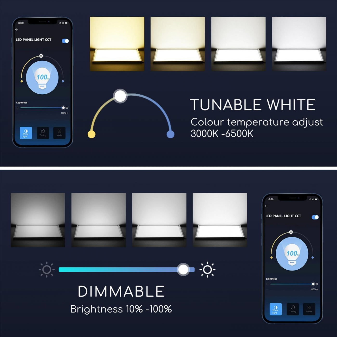 Panel LED con nueva difusión de luz Backlight que ofrece 5 años de garantía contra el amarillamiento del panel led. Con una altura de solo 26mm y Driver led con certificado TUV. Marco en color blanco para una mejor integración en la decoración. Ahorro de hasta un 70%. Alta luminosidad, proyección de la luz de forma uniforme. Control WiFi selector de color 3000K (blanco cálido), 4000K (blanco neutro), 6000K (blanco frío) e intensidad.