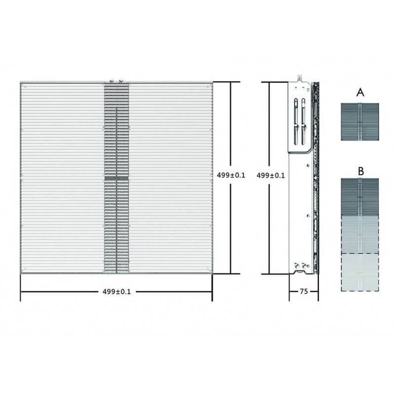 Pantalla LED Transparente formada por cuatro módulos apilables MAGIC de 499mm X 499mm. Permite la configuración del tamaño deseado de pantalla LED transparente. Los modulos vienen completamente acabados y con todas sus sistemas de interconexión entre otros módulos.