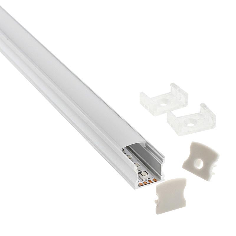 Kit que incluye perfil de aluminio anodizado de 1 metro, cubierta opal y tapas laterales.