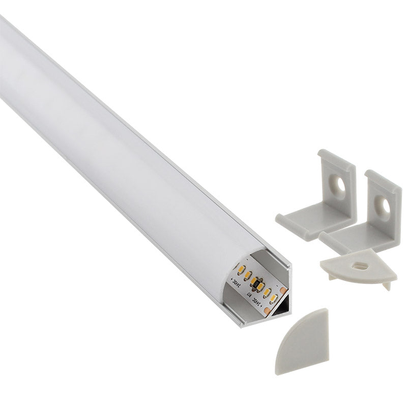 Kit que incluye perfil de aluminio anodizado de 2 metros KORK mini, cubierta opal, tapas y clips de sujección.