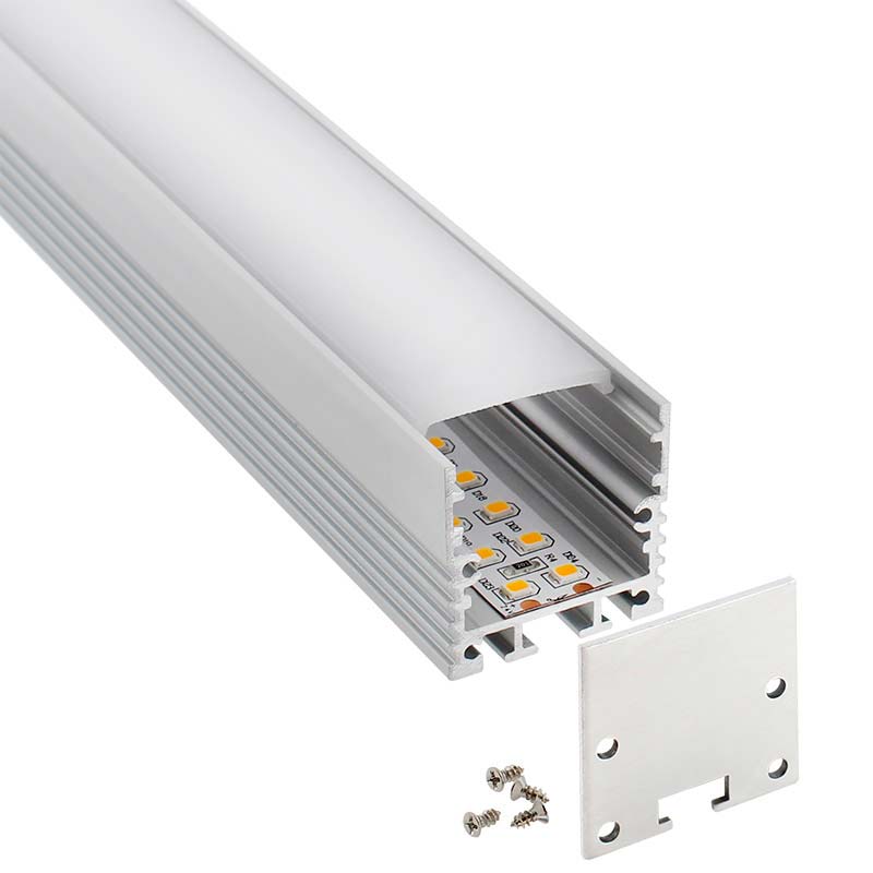 Kit que incluye perfil de aluminio anodizado de 1 metro, cubierta opal y tapas laterales.