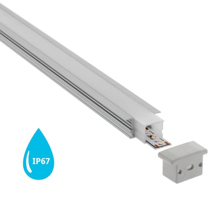 Perfil de aluminio para proteger las tiras led, lo que permite realizar instalaciones profesionales, limpias y con estilo. Incluye pletina disipadora, tubo de policarbonato, tapones de silicona y tapas finales. Con protección IP67