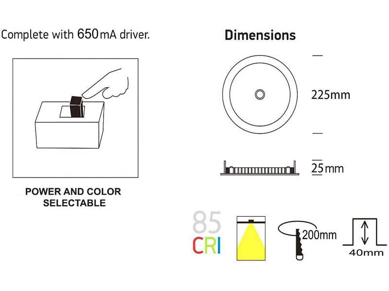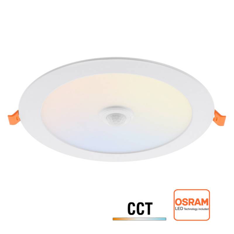 Luminaria TODO EN UNO. Downlight LED con chip led OSRAM con sensor PIR (detector de movimiento y luminosidad), selector de potencia 24W-22W-20W-18W y selector de color 2700K-3000K-4000K-5700K (4xCCT luz cálida, neutra o fría), NO Flicker (sin parpadeos).
