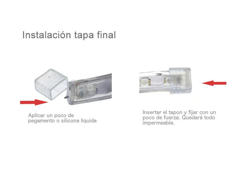Tapa de fin de linea específico para tira LED a 220V. Permite sellar el extremo de la tira LED. Se aconseja utilizar pegamento o algún otro material adhesivo para fijarlo.
