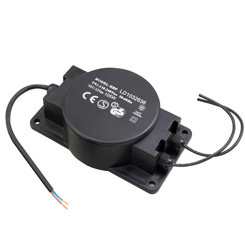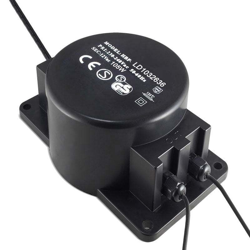 Transformador  de corriente, entrada AC de  220V y salida 12V de tipo AC, 105W de potencía máxima y protección IP68. Para lámpara de piscina tipo PAR56 y otras luminarias que requieran entrada 12V AC.