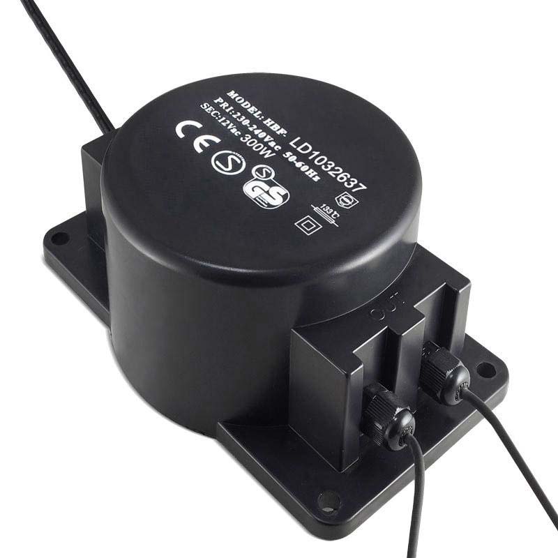 Transformador  de corriente  220V y salida 12V de tipo AC, 300W de potencía máxima y protección IP68. Para lámpara de piscina tipo PAR56 y otras luminarias que requieran entrada 12V AC.