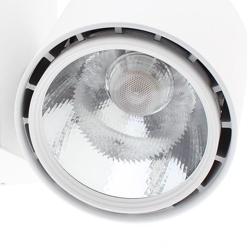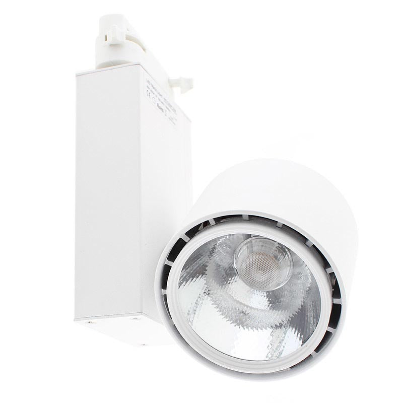 Proyector para carril led con conector monofásico de calidad profesional con chip led CREE y driver certificado TUV con cuerpo en aluminio y lacado en color blanco mate, incluye conector a carril. Indicado para todo tipo de iluminación técnica, Uso comercial y profesional, oficinas, salas de exposiciones, etc.