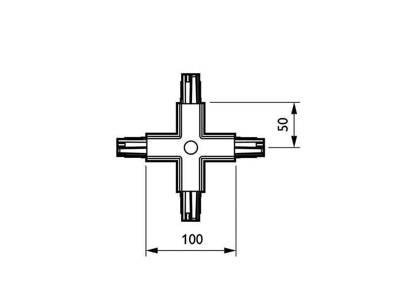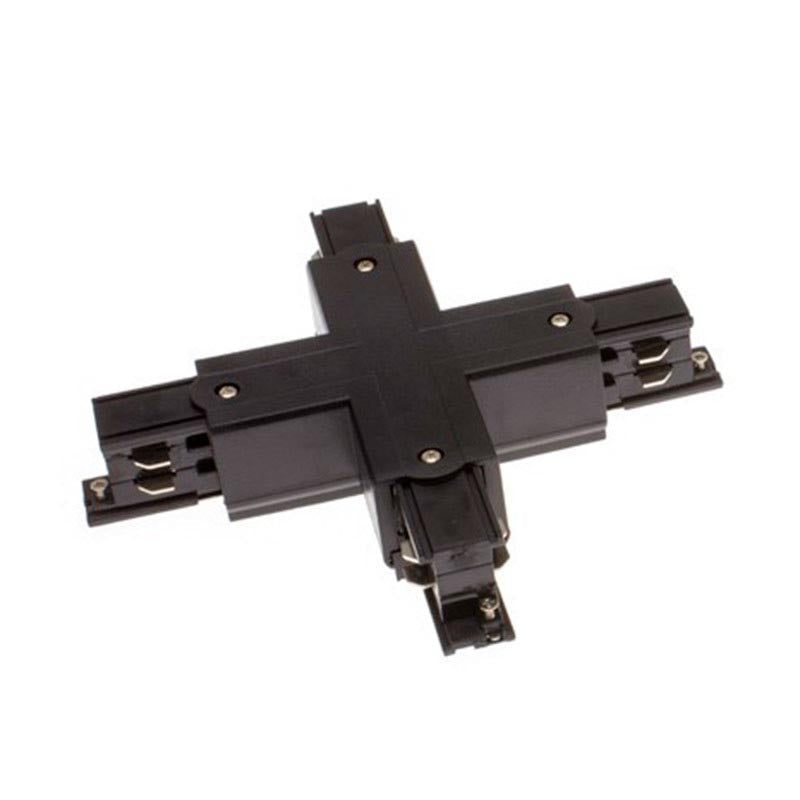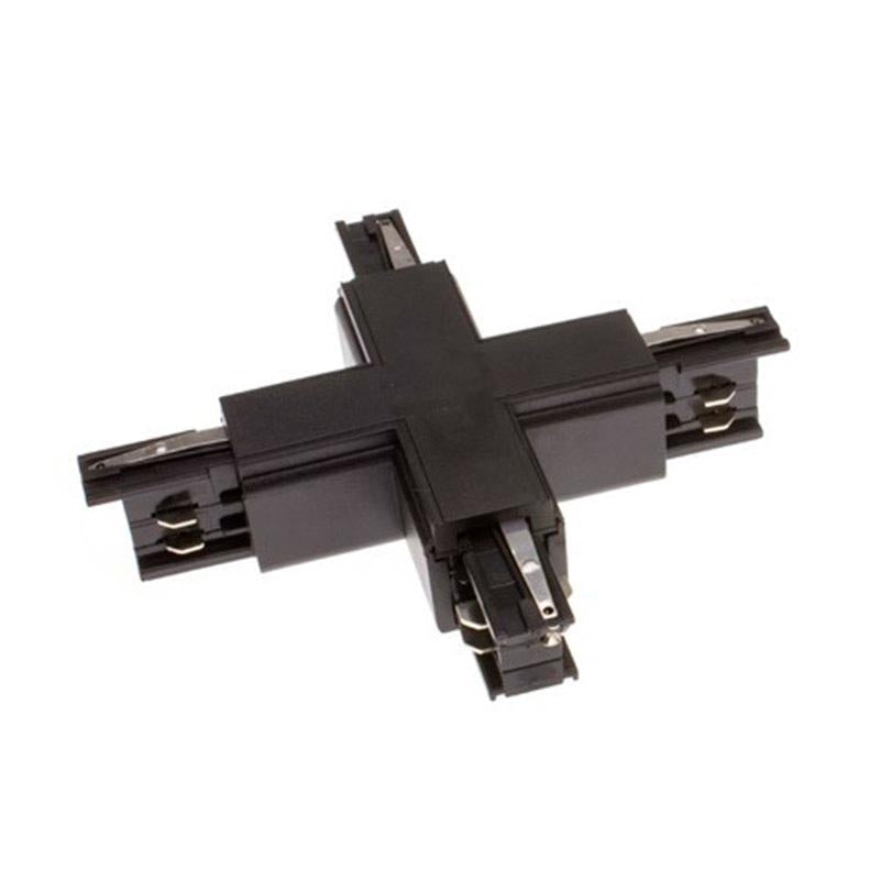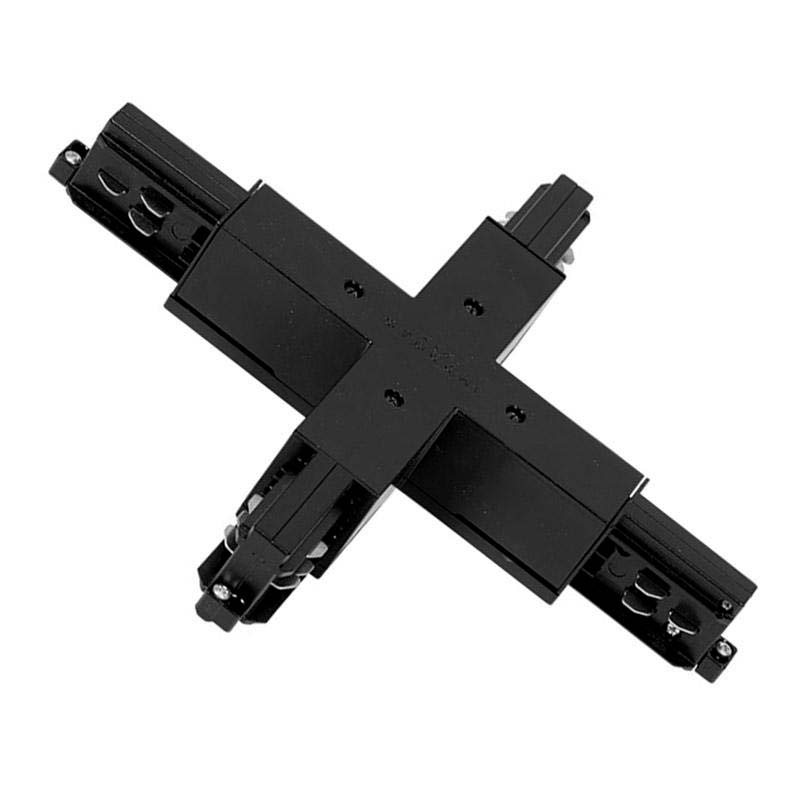 Conector en forma de X para unir y alimentar eléctricamente dos tramos de carril.