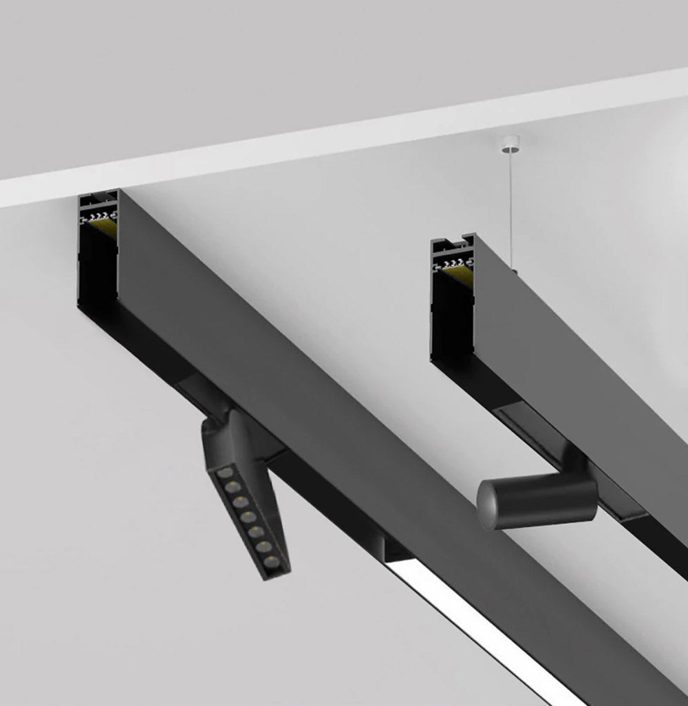Carril de 1 metro de longitud de color negro para fijar en supoerficie o suspendido. Incorpora banda magnética y pistas eléctricas para conectar las luminarias MAGNETIC de forma rápida y fácil.