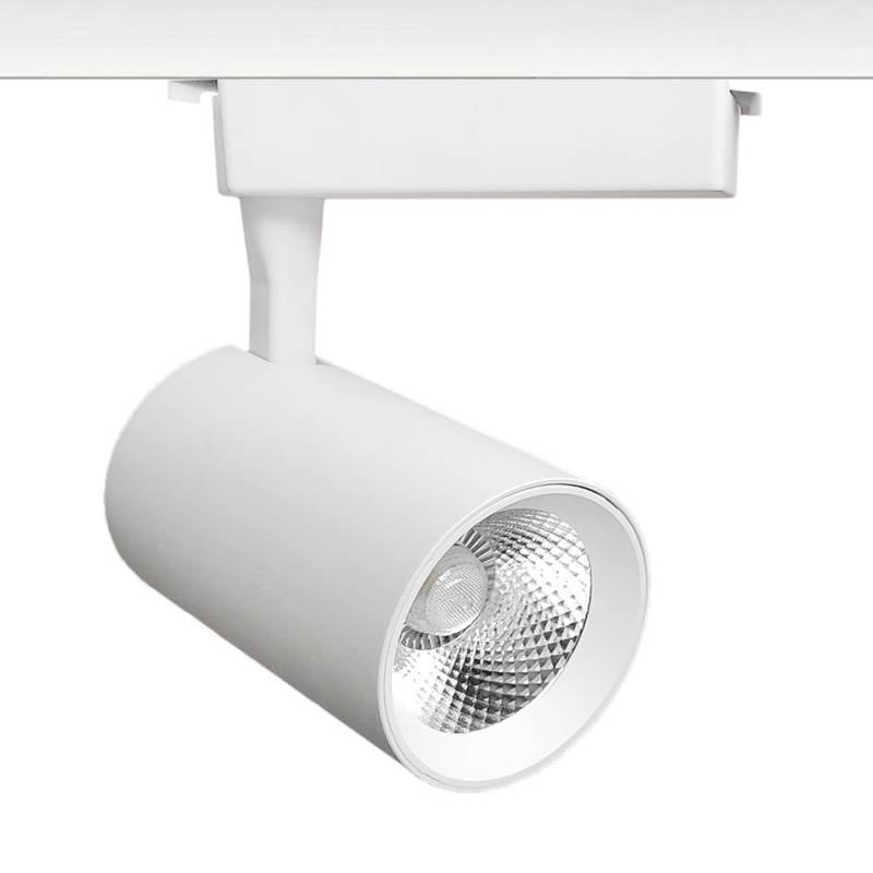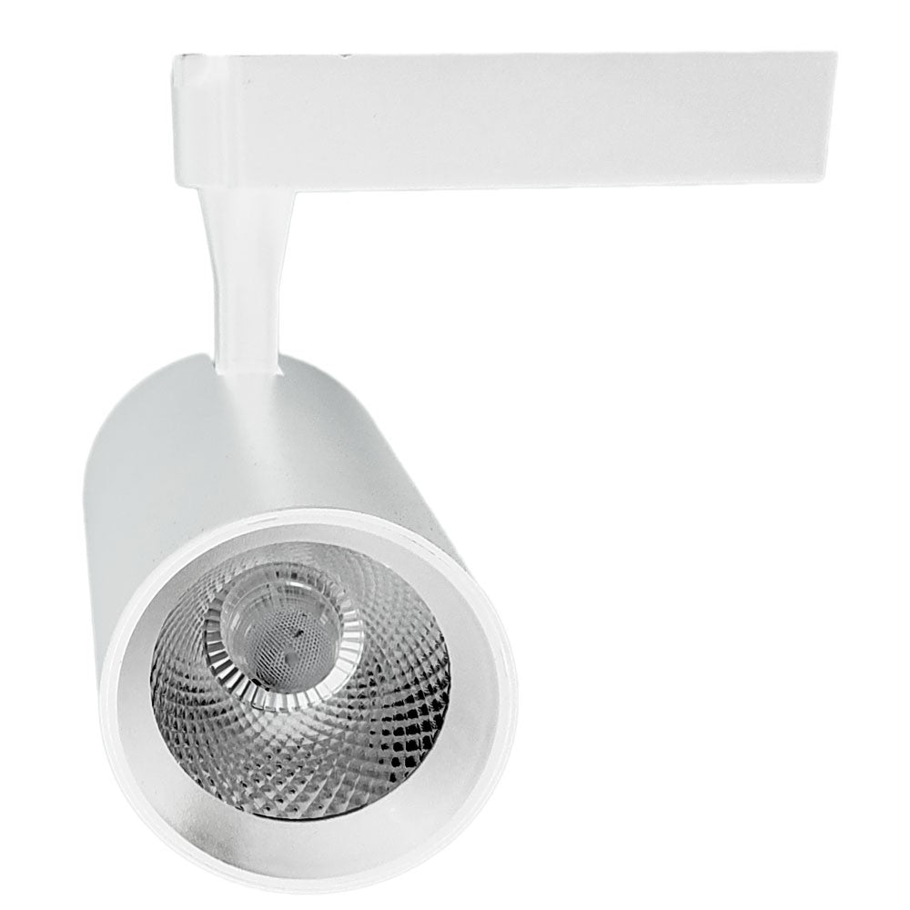 Proyector para carril led con conector monofásico, orientable en todas direcciones y fabricación de alta calidad en aluminio y lacado en color blanco mate, incluye conector carril monofónico. Indicado para todo tipo de iluminación técnica, Uso comercial y profesional, oficinas, salas de exposiciones, etc. Con chip led Bridgelux y CRI>90