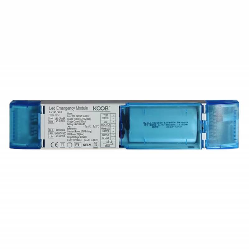 Módulo de emergencia con batería recargable y sustituible de Litio de gran capacidad que proporciona energía en caso de fallo eléctrico para luminarias Led de 3 a 55W con un 30% de potencia en caso de fallo en el suministro de electricidad. Salida voltaje DC 9-80V