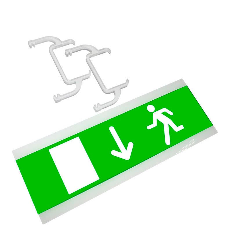 Incluye: Pieza de metacrilato con señalización y 2 soportes para adaptar a las luminarias de emergencia EMERLUX F415
