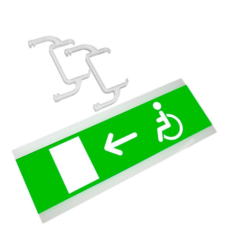 Incluye: Pieza de metacrilato con señalización y 2 soportes para adaptar a las luminarias de emergencia EMERLUX F415