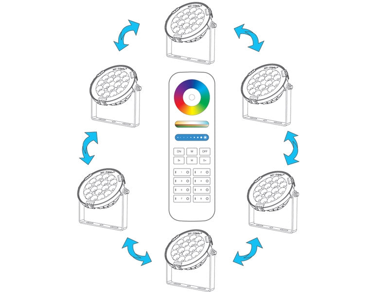 Proyector de altas prestaciones con chip Nichia RGB + CCT. Controla el proyector desde el mando a distancia RF específico (ver accesorios), puedes escojer el mando que prefieras en el pack a un precio especial y empieza a controlar toda la iluminación desde la palma de tu mano. Puedes controlar hasta 4 ó 8 grupos de proyectores (dependiendo del mando a distancia). Cada proyector recibe la señal y la transmite a los proyectores que están a su alcance hasta un máximo de 30 metros entre cada unidad, alargando así la capacidad de la instalación.