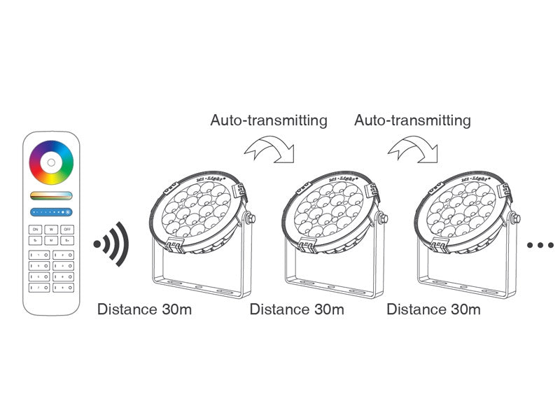 Proyector de altas prestaciones con chip Nichia RGB + CCT. Controla el proyector desde el mando a distancia RF específico (ver accesorios), puedes escojer el mando que prefieras en el pack a un precio especial y empieza a controlar toda la iluminación desde la palma de tu mano. Puedes controlar hasta 4 ó 8 grupos de proyectores (dependiendo del mando a distancia). Cada proyector recibe la señal y la transmite a los proyectores que están a su alcance hasta un máximo de 30 metros entre cada unidad, alargando así la capacidad de la instalación.
