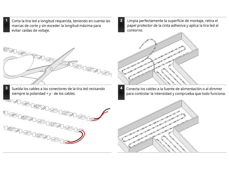 Para la instalación de una tira LED necesitas una fuente de alimentación y opcionalmente un dimmer para regular la intensidad y efectos de luz. Además dispone de accesorios para conectar y empalmar tiras LED. Es importante instalar la tira sin que se solapen los led y resistencias para que no se deterioren por el calor generado.