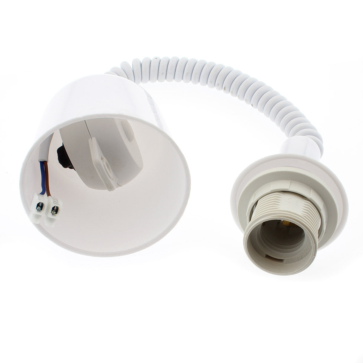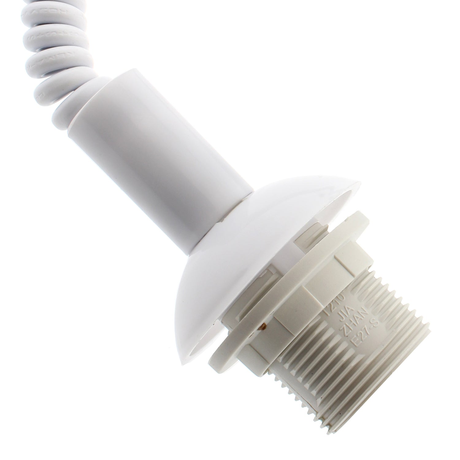 Base de lámpara colgante con casquillo E27. Dispone de un mecanismo que le permite regular su altura desde 35 hasta 120 cm. Incorpora colgador, recojerdor de hilo sobrante y cable rizado.