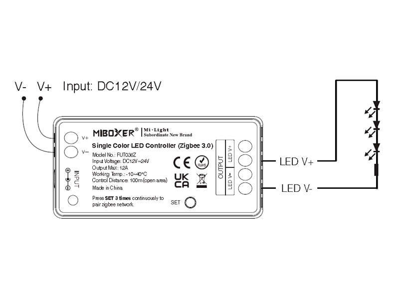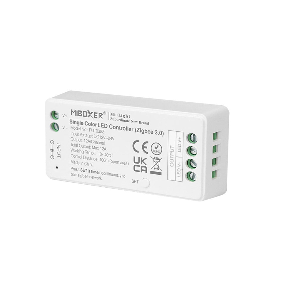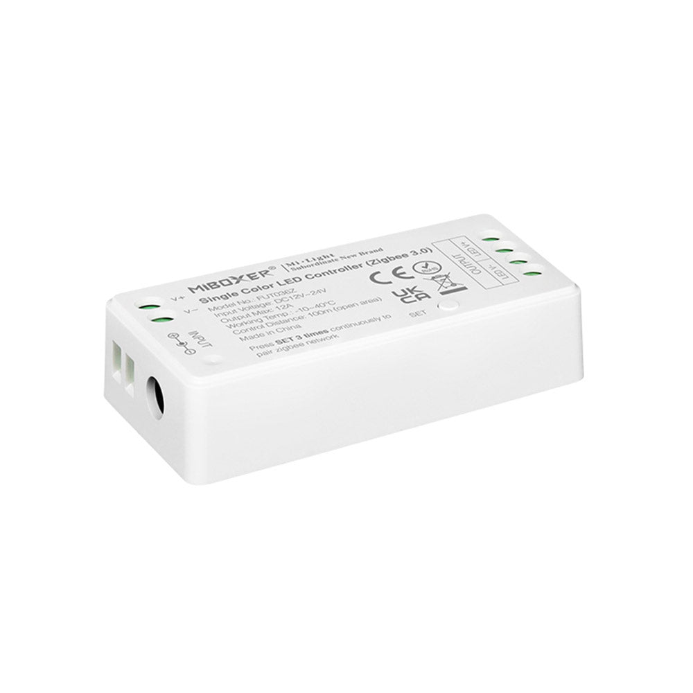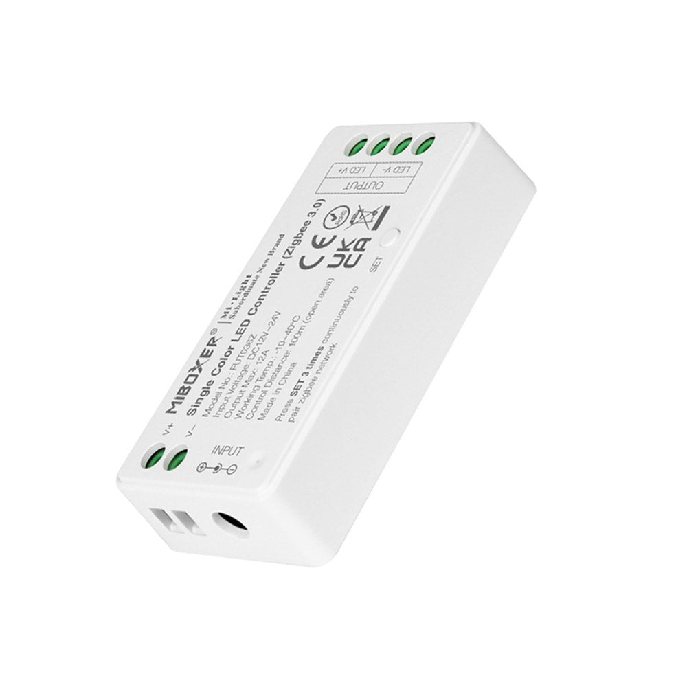 Controlador compatible con el standar Zigbee 3.0 que proporciona a los usuarios un control inteligente de las tiras led monocolor conectadas. Fácil instalación y conectividad ZigBee. Control a través de mando a distancia, APP o Voz