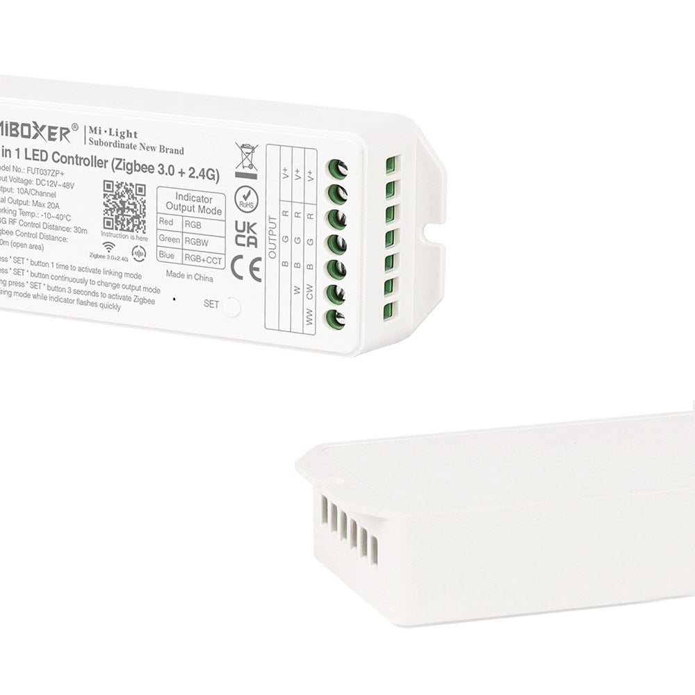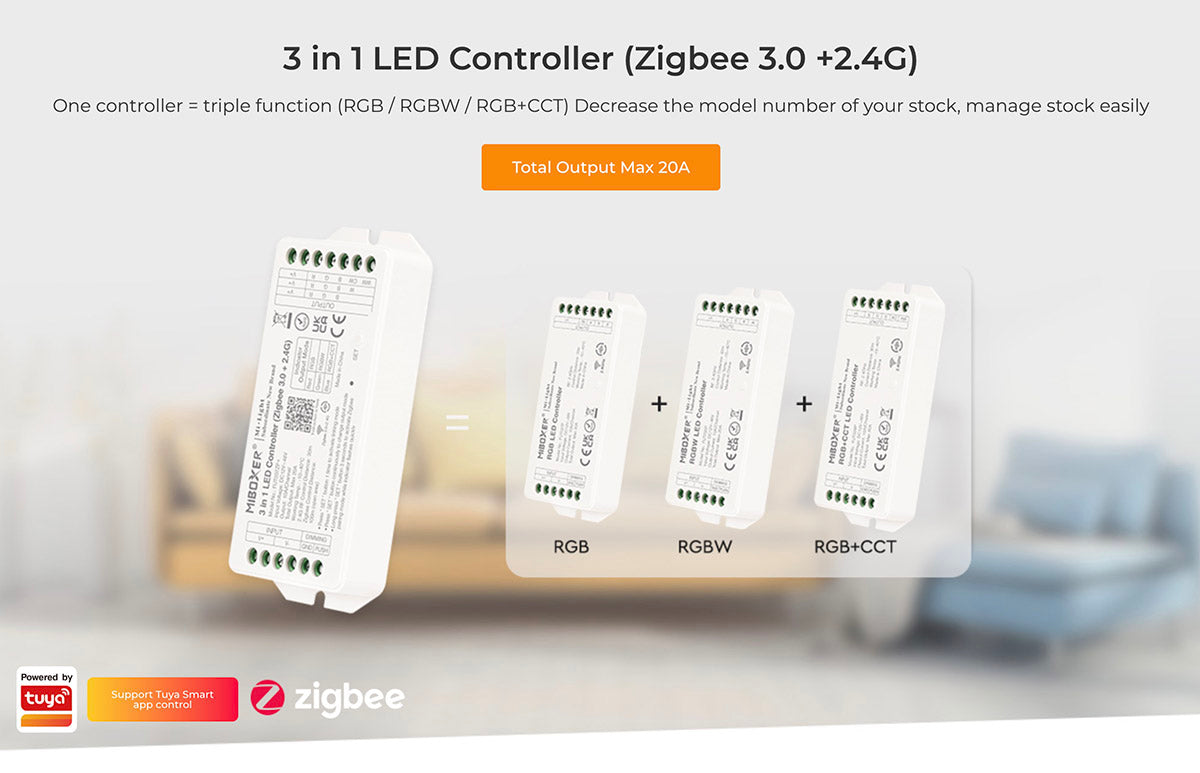Controlador compatible con el standar Zigbee 3.0 + 2.4G RF 2 en 1, para tiras RGB+RGBW+RGBCCT. Proporciona a los usuarios un control inteligente de las tiras led monocolor conectadas. Fácil instalación y conectividad ZigBee. Control por ZigBee 3 + 2.4G RF + Philips Hue + APP Tuya + Amazon Alexa + Google Home + IKEA TRADFRI