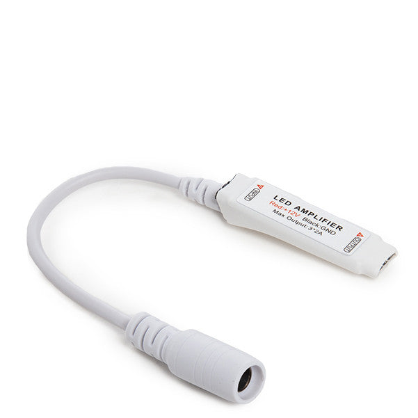 El Amplificador de Señal Mini para Tiras de LEDs posibilita acondicionar la señal a lo largo del tramo de tira LED, posibilitando que la intensidad que pasa por la tira siga estable y sin ninguna caída en la totalidad de su longitud. Cuenta con una entrada y una salida para adaptar los dos tramos de tiras LED y 2 salidas para la fuente de alimentación deseada.