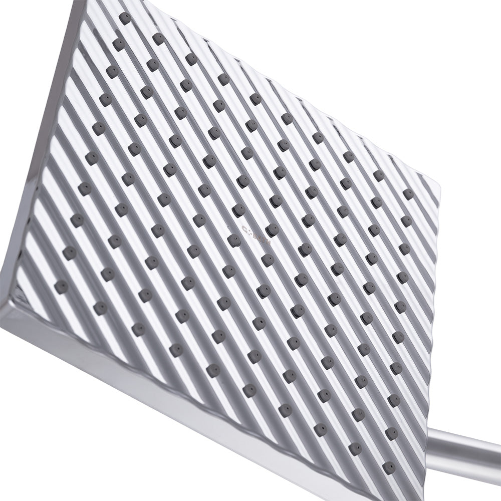 Rociador de ducha en acabado cromado con chorro efecto lluvia. Cuenta con picos de base de silicona que facilitan la limpieza del rociador, evitando que la cal se acumule. El consumo de agua de chorro lluvia a 3 bars es 24 l/min.