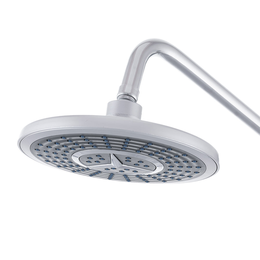Rociador de ducha en acabado cromado con chorro efecto lluvia. Cuenta con picos de base de silicona que facilitan la limpieza del rociador, evitando que la cal se acumule. El consumo de agua de chorro lluvia a 3 bars es 24 l/min.