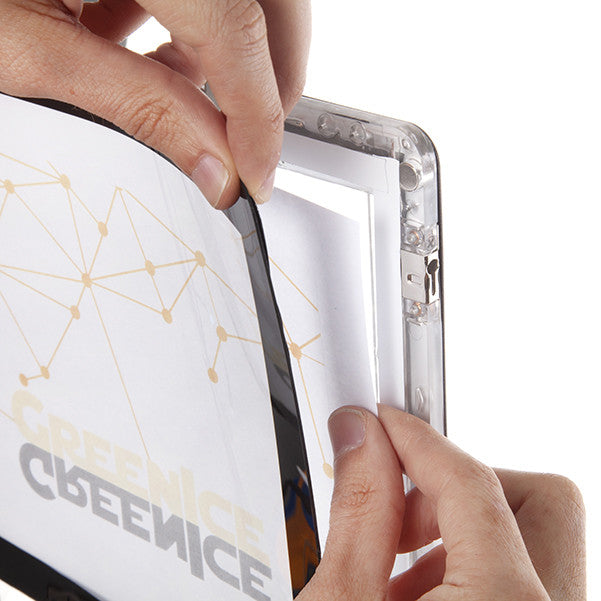 Carpeta Poster LED de doble cara, para láminas de formato A4.Apertura de forma sencilla mediante sistema magnético.