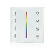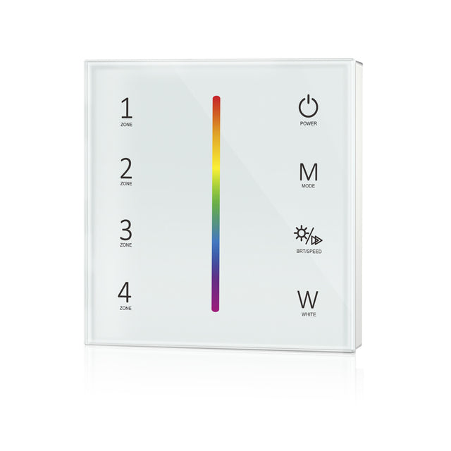 Controlador con tecnología de radiofrecuencia. Características del producto: Control de pared táctil por radio para controlar módulos LED RGBW. Señal de salida: 2.4 GHz. Tensión de entrada: 100…240 V. Beneficios del producto: Panel táctil de cristal ultra sensible de alta resistencia con barra de color táctil en el medio y retroiluminación.. Regulación de los colores RGB y blanco establecidos. 10 gradientes de color preinstalados. Controla hasta 4 zonas. Control de los colores rojo, verde, azul y blanco por separado. Fácil de reemplazar por interruptor estándar. Áreas de aplicación: Iluminación general. Iluminación de arquitectura. Luz dinámica como efecto arquitectónico en zonas públicas. Iluminación de bóvedas. Hoteles. Oficinas. Interiores residenciales.